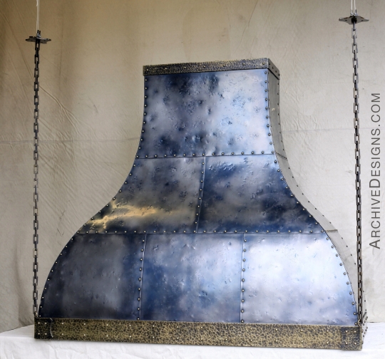 A dark patina kitchen hood in distressed stainless and hammered brass, with specialty chain supports. Archive Designs created this hood for a S.R. Gambrel project in Watermill, New York.