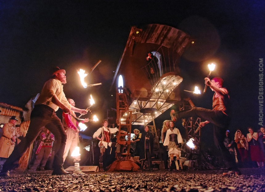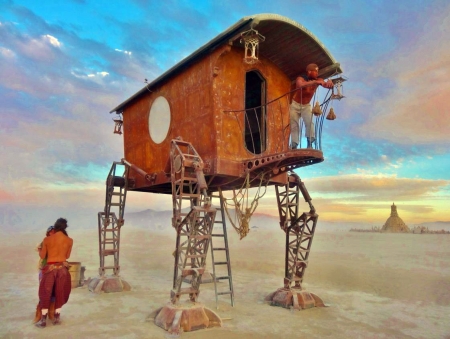 Lost Nomads of Vulcania Teluriz from Burning Man 2014 (photo by Rubens Bürgel)."Lost Nomads of Vulcania," a 2014 Burning Man art installation, was a steampunk-inspired gypsy encampment featuring the Teluriz, one of the few remaining Vardo Class Steam Walkers built by the last surviving members of Captain Nemo’s crew. The intrepid explorer are be able to enter the Teluriz through the hatch and contemplate the mysterious disappearance of the crew and the ephemera left behind. What were they doing so far from the island of Vulcania in the desert wasteland of Blakroxiti?
